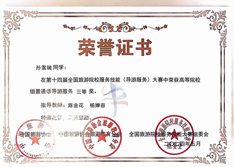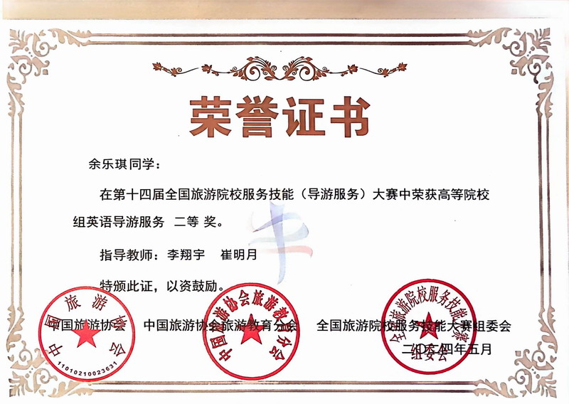 2024年5月23日至26日,第十四届全国旅游院校服务技能(导游服务)大赛在河南郑州举行,旅游与地理学院选派了周颖、余乐琪、张一博、孙雪瑞4名学生分别参加了英语导游服务和普通话导游服务项目。经历激烈角逐,2022级旅游管理专业学生周颖、余乐琪分别夺得英文组赛项二等奖;2021级旅游管理专业学生张一博,2022级旅游管理专业学生孙雪瑞分别夺得普通话组赛项三等奖。