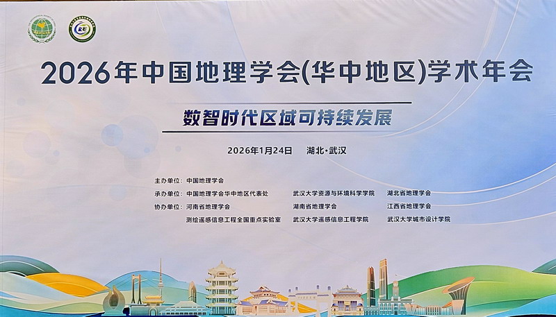 124日,2026年中国地理学会(华中地区)学术年会在武汉大学隆重召开。本次年会以“数智时代区域可持续发展”为主题,吸引了来自武汉大学、中国地质大学(武汉)、华中师范大学、河南大学、湖北大学、湖南师范大学、江西师范大学等全国40余所高校和科研院所的300余名专家、学者及研究生参会。我院副院长、江西省地理学会副理事长陈海龙与闻熠、望勇、雷彬三位博士一同参加了此次学术盛会。