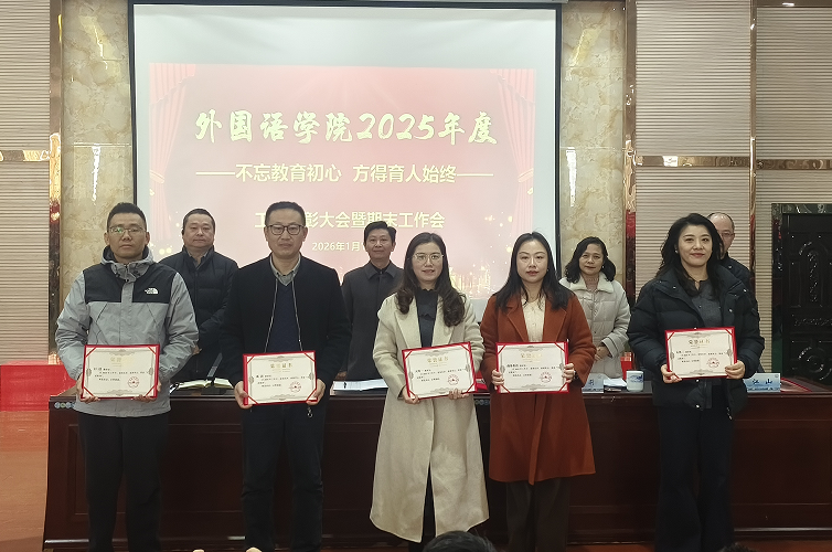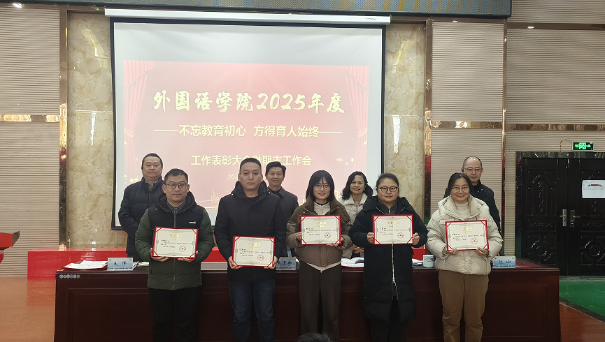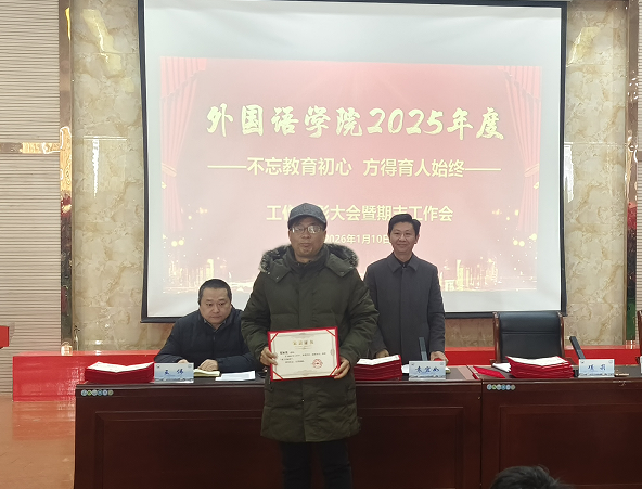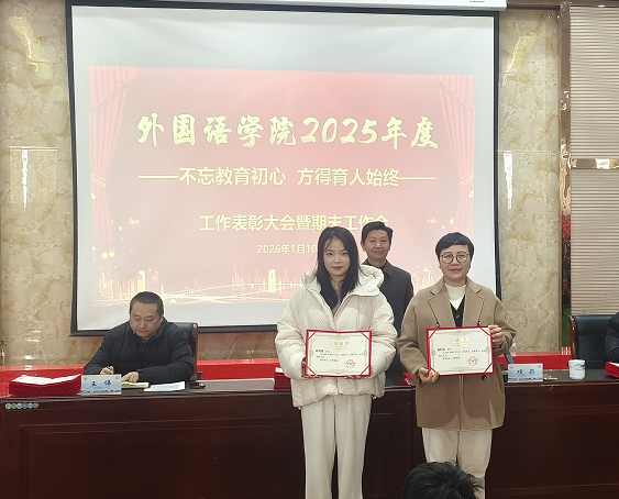 党委副书记江山宣读了《外国语学院关于2025年度工作表彰的决定》。大会对2025年度在教学、科研、学科建设、人才培养及社会服务等方面工作中取得突出成绩的个人和集体给予了表彰。院领导为获奖代表颁发了荣誉证书。