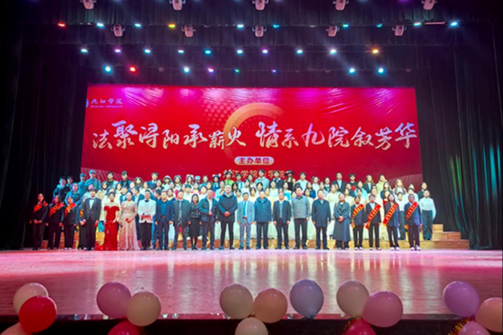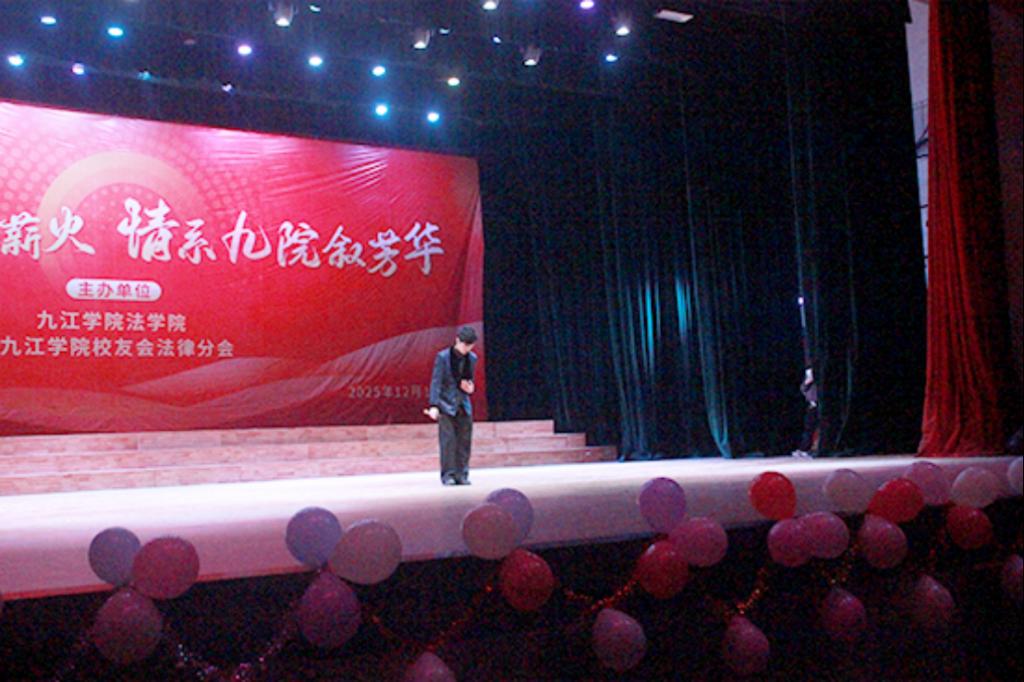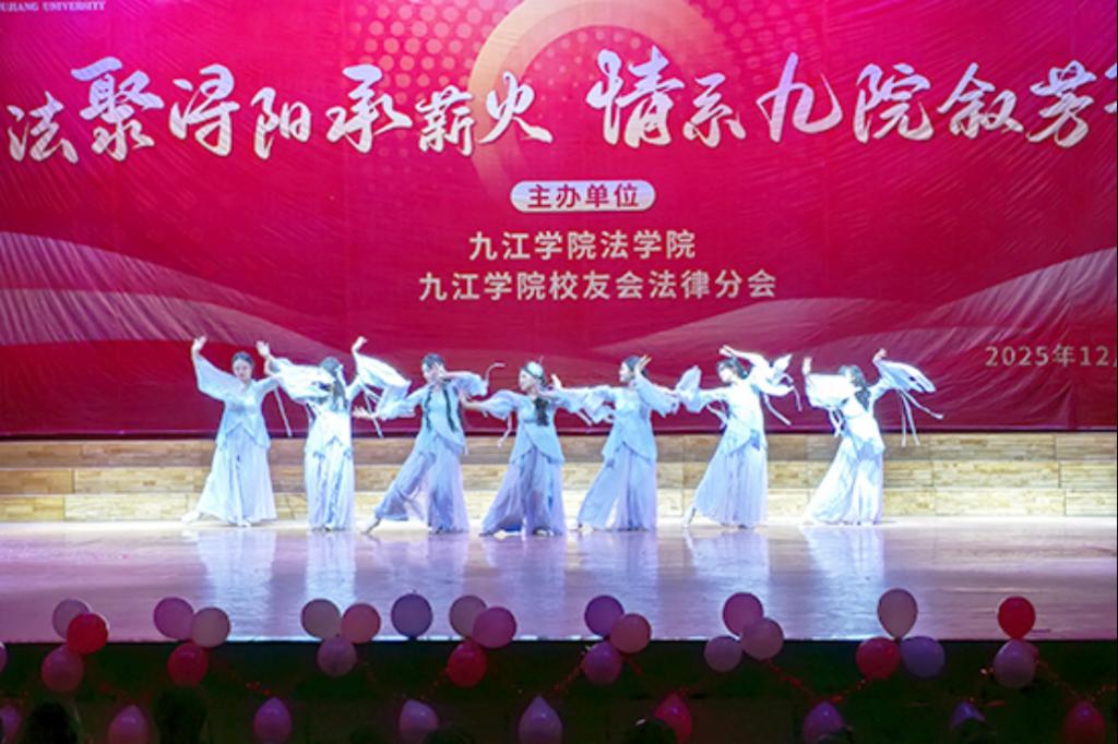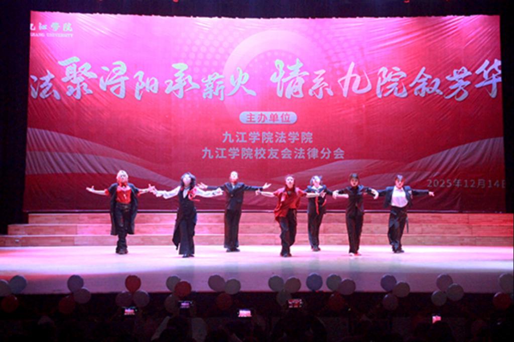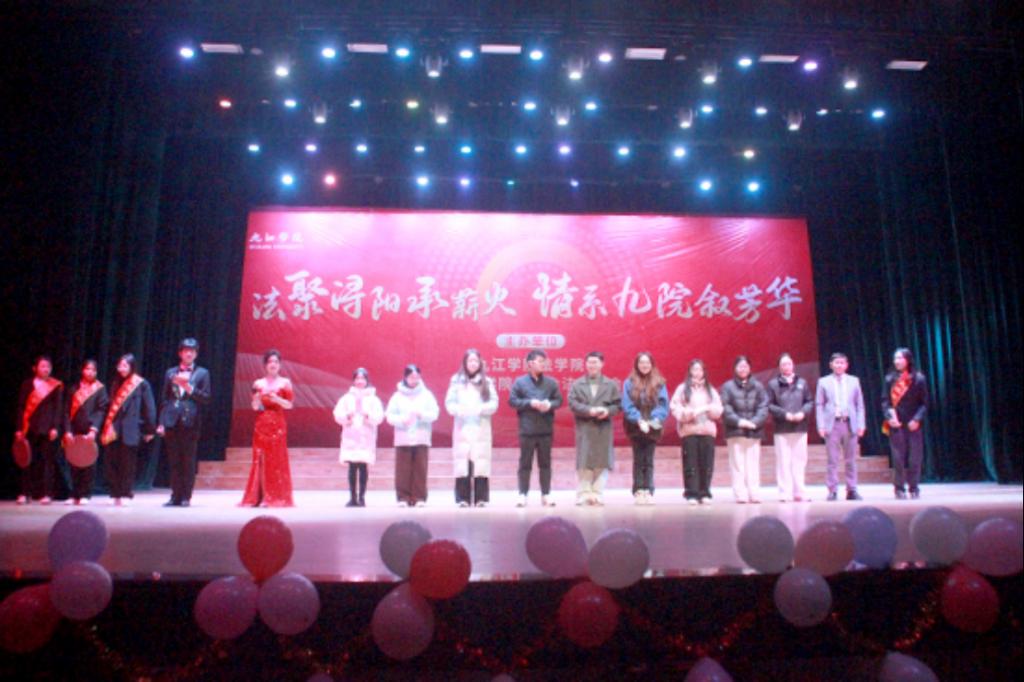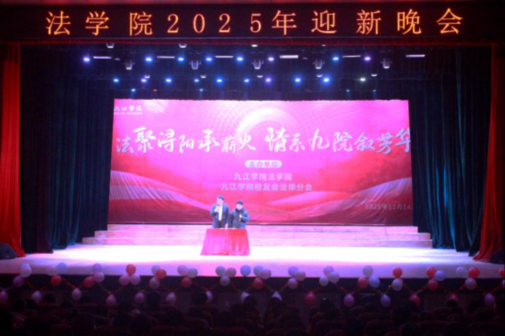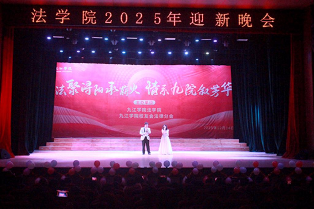 2025 年 12 月 14 日晚,九江学院法学院携手九江学院校友会法律分会在大礼堂隆重举办“法聚浔阳承薪火 情系九院叙芳华”主题晚会。党委委员、副校长查振华莅临观看,学生工作处副处长张堑、法学院党政领导、九江学院校友会法律分会代表及师生代表齐聚一堂,共赏这场兼具青春朝气与温情底蕴的文艺盛宴。