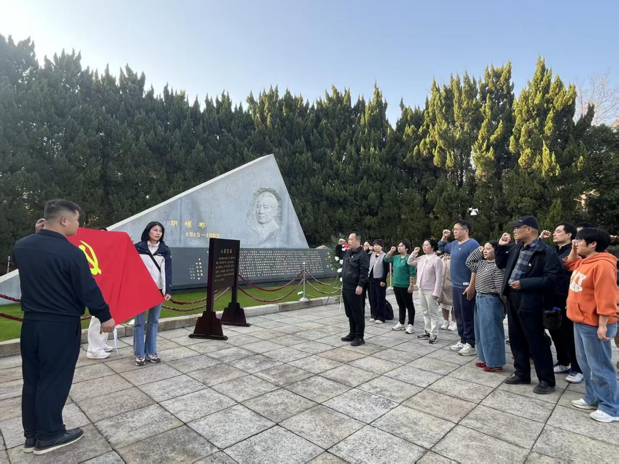 富华山间松柏苍翠,胡耀邦陵园庄严肃穆。支部党员们怀着崇敬之心缓步来到胡耀邦同志陵墓前,全体肃立。在领誓人带领下,大家集体鞠躬并默哀,以此寄托对这位伟大无产阶级革命家的深切缅怀。默哀毕,全体党员面向鲜红的党旗,举起右拳庄严宣誓,铿锵有力的入党誓词回荡在陵园之中,既是对革命先辈的深情告慰,也是对自身信仰的再次淬炼。