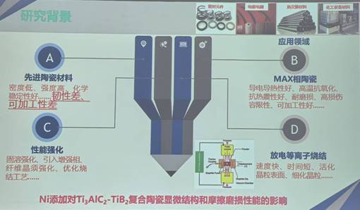 许欢博士分享了“Ni添加对Ti3AlC2-TiB2复合陶瓷显微结构和摩擦磨损性能的影响”报告,针对现有的陶瓷材料存在韧性差、可加工性差等问题,分享了利用MAX相结构陶瓷开发研究及其在工业领域的应用。通过固溶强化方法原位引入增强相,通过SPS烧结实现复合陶瓷的制备。通过TiTiCAlB4C球磨混合,最后压样烧结,分析了烧结曲线,发现适量Ni的添加能够通过固溶和中间液相形成促进致密化。对不同含量的Ni添加陶瓷进行了显微结构、摩擦磨损性能进行了分析,得到了一些有意义的结论。最后许欢博士结合自己对研究工作思考与工作内容,与在座老师进行探讨与交流。