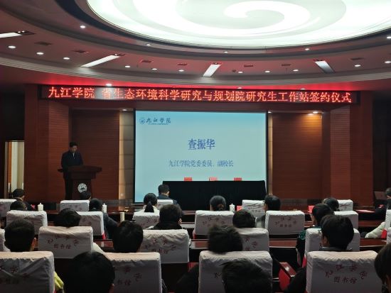 3月15日上午,九江学院与江西省生态环境科学研究与规划院联合共建全日制专业学位研究生工作站签约仪式在逸夫图书馆报告厅举行。江西省生态环境厅党组成员、副厅长杨期勇,我校党委委员、副校长查振华,江西省生态环境科学研究与规划院院长刘足根、副院长李惠民,九江市生态环境局党委书记、局长张南等出席仪式。签约仪式由校党委委员、副校长吴维勇主持。