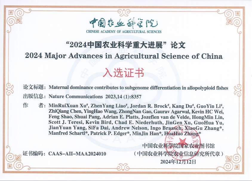 团队在Nature Communications期刊的研究成果入选10项代表2023年我国农业科技前沿、取得重大突破性进展的基础科学研究成果。2024年12月,成果以中国农业科学重大进展的形式在《2024中国农业科技发展论坛暨全球农业研究热点前沿与科技竞争力成果发布会》面向全球进行发布。此外,在2023年中国水产学会青年学术年会、江西省水产学会2023年学术年会暨江西省鲤鲫鱼遗传育种技术研讨会上作题为“母本优势有助于异源四倍体鱼类的亚基因组分化”特邀报告,在领域内产生了很高的影响力和知晓度,弘扬了我省水产行业学者在基础研究中的创新精神。(完成人:张化浩、张小谷)