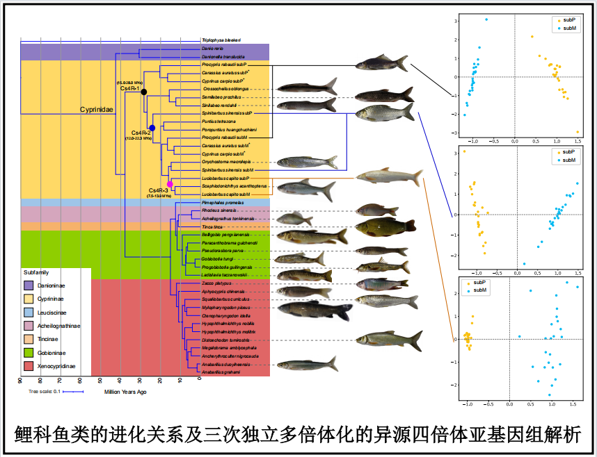 团队首次系统解析了多次独立多倍体化异源四倍体鲤科鱼类亚基因组的起源和提出了亚基因组不对称进化的普遍规律;首次在动物中发现来源于母本的亚基因组显著富集免疫相关的串联重复基因,揭示了母本亚基因组在多倍体鲤科鱼类适应外界环境中起重要作用。上述研究结果对阐明亲本基因组融合后的不对称进化规律、多倍体物种的形成、基因组变异模式及其对性状形成的影响等具有重大意义。