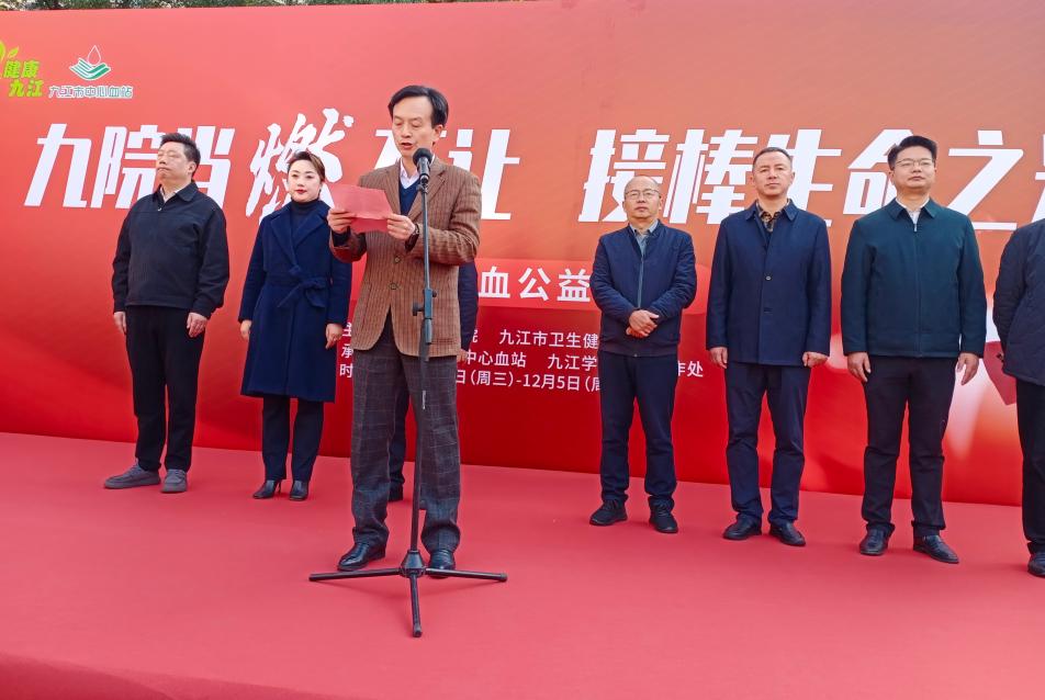 深秋微凉,爱心滚烫,12月3日下午,九江学院2025年无偿献血活动启动仪式在第三食堂门前广场举行。本次活动以“九院当‘燃’不让 接棒生命之光”为主题,旨在弘扬无私奉献精神,培养师生社会责任感。校党委委员、副校长吴维勇,九江市卫生健康委员会党委委员、副主任胡国斌,九江市中心血站党总支书记、站长丁杰,九江学院学生工作处负责人等出席活动。各二级学院学生科负责人及500余名学生志愿者参加仪式。