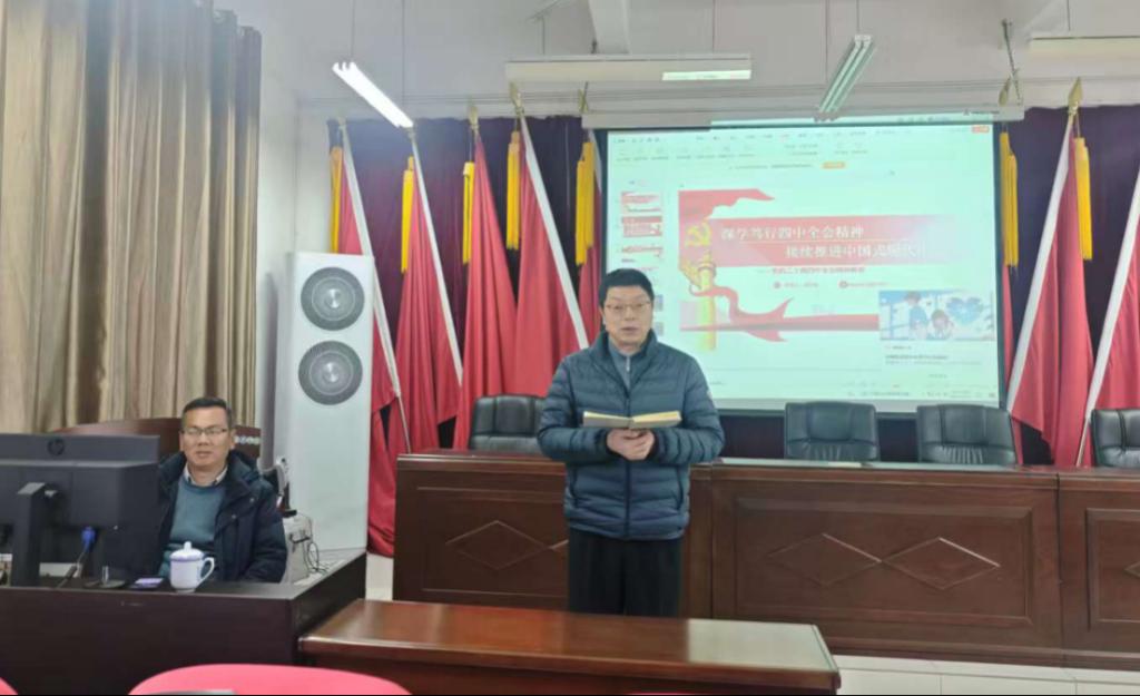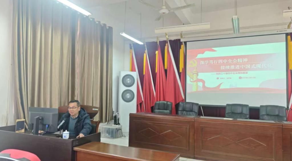 为深入推动党的二十届四中全会精神深入人心,引导学院师生党员全面把握全会核心要义与实践要求,深刻领悟新时代使命担当,2025年12月12日下午,法学院党委在香远楼624会议室召开了党的二十届四中全会精神专题宣讲会。会议特邀学校马克思主义宣讲团成员、马克思主义学院徐红林老师作专题辅导报告。宣讲会由法学院党委书记刘羲之主持,全院教职工及学生党员共同参会学习。