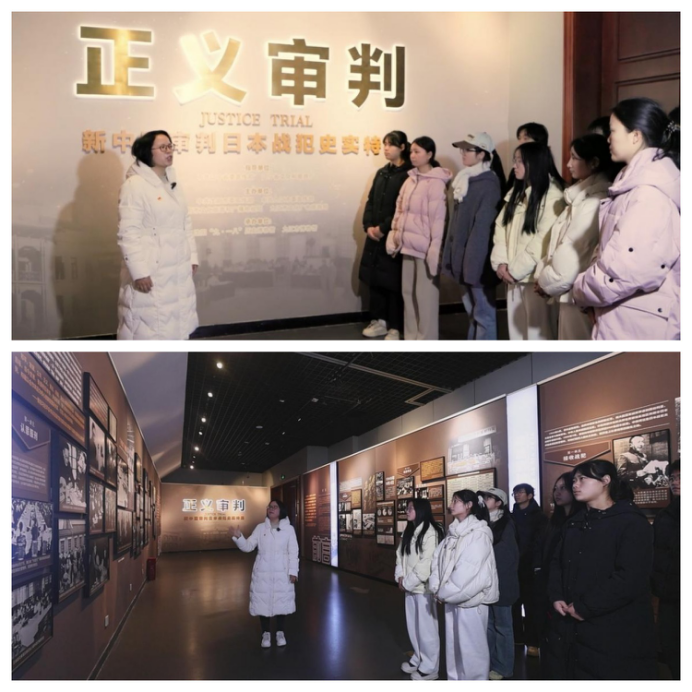 揭牌仪式结束后,在九江九八抗洪展陈馆讲解员的引领下,在场的师生依次参观了各个展厅。一幅幅惊心动魄的历史照片、一件件饱经风霜的实物展品、一幕幕感人至深的场景复原,生动再现了1998年特大洪水面前,军民一心、不畏艰险、勇斗洪魔的英勇事迹,深刻诠释了“万众一心、众志成城,不怕困难、顽强拼搏,坚韧不拔、敢于胜利”的伟大抗洪精神。大家驻足凝视,仔细聆听,无不为抗洪时期军民展现出的坚定信念、顽强意志和牺牲精神所深深震撼和感动。随后,九江学院马克思主义学院组织师生前往九江博物馆,开展了一堂特殊的思政实践课:参观“正义审判——新中国审判日本战犯史实特展”。一段沧桑的抗战历史,一场沉浸式体验,使学生在《正义审判》特展前深刻体悟伟大抗战精神;感受正义力量!