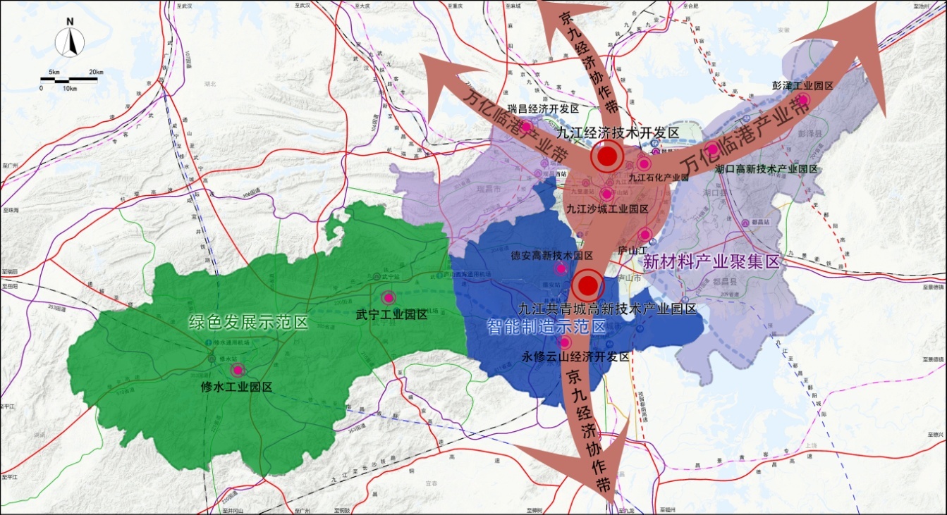 促进产业区域分工协作。加强与南昌产业的合作对接,夯实大南昌都市圈关键支撑。主动融入长江经济带,积极对接粤港澳和长三角。依托九江经开区,加强与武汉国家生物产业基地在医药研发、生产、营销等重点领域的合作。依托共青城高新区,加强与昆山高新区的合作,以“创新驱动发展示范区和高质量发展先行区”为目标,探索区域合作共建的新路径和新机制,形成可复制、可推广的经验。依托金属新材料优势发展高性能金属材料,与湖南新材料产业对接,着力建设硬质合金及高性能金属材料产业基地。以合芜蚌自主创新综合试验区为合作对象,引导九江形成电子信息产业产学研共同体。主动承接大湾区电子信息、高端装备制造、新材料等产业转移,加强与大湾区科技机构合作,共建重点产业技术创新联盟和研发机构,打造协同创新平台,合作开展重大科技专项、重点研发计划项目,建立赣粤港澳飞地产业园。