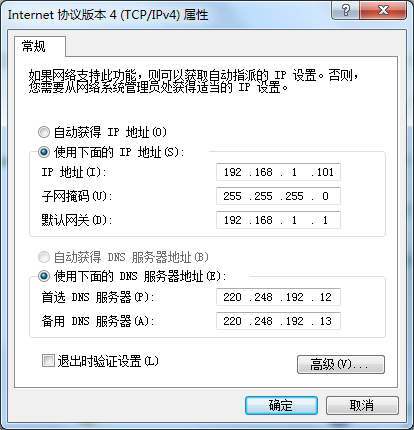 (四) 单击“本地连接”链接,出现如下窗口,填写信息技术中心分配给你使用的IP地址、子网掩码、默认网关、DNS地址,点击确定即可
