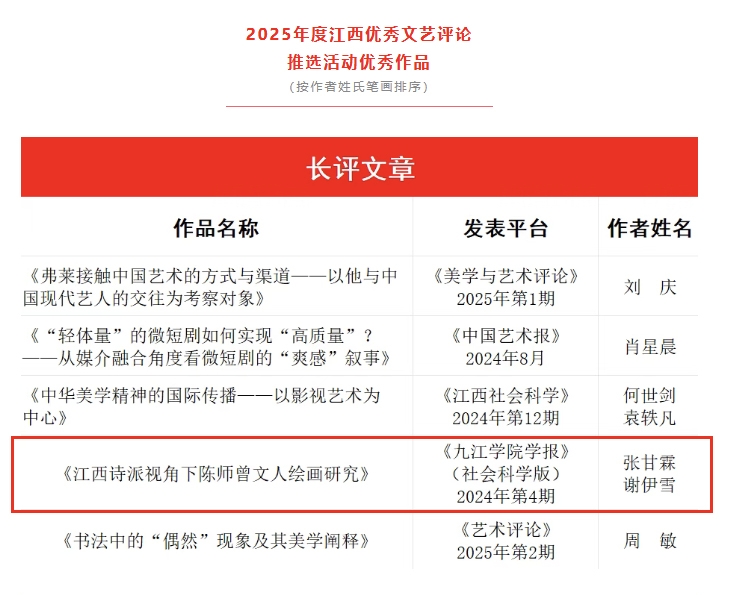 近期,由江西省文联主办,省评协承办的2025年度江西优秀文艺评论推选活动已完成评审全省评选出10篇优秀文艺评论,校教师张甘霖、谢伊雪作品江西诗派视角下陈师曾文人绘画研究入选,该作品原载于20244九江学院学报社会科学版)。