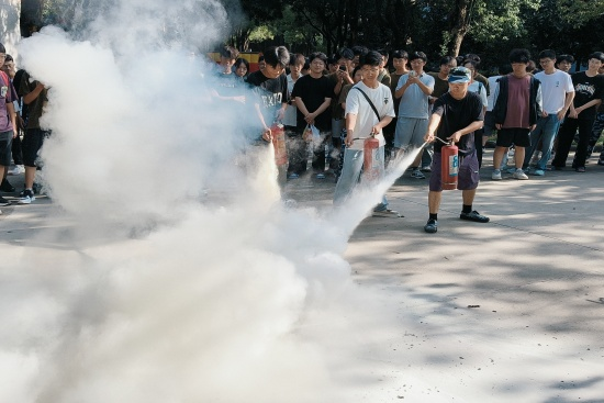 宣讲环节在竞知楼阶七教室进行,消防宣讲员结合高校火灾案例,讲解宿舍用电用火规范、隐患排查及初起火灾扑救等方法,强调“冷静、弯腰、低姿、捂口鼻”等逃生要点,并现场演示灭火器的使用。随后,在学生公寓15栋西侧空地上进行,实战演练包括“黑暗逃生体验屋”(模拟烟雾、曲折通道)。新生严格遵循要领有序撤离,全员按时完成。