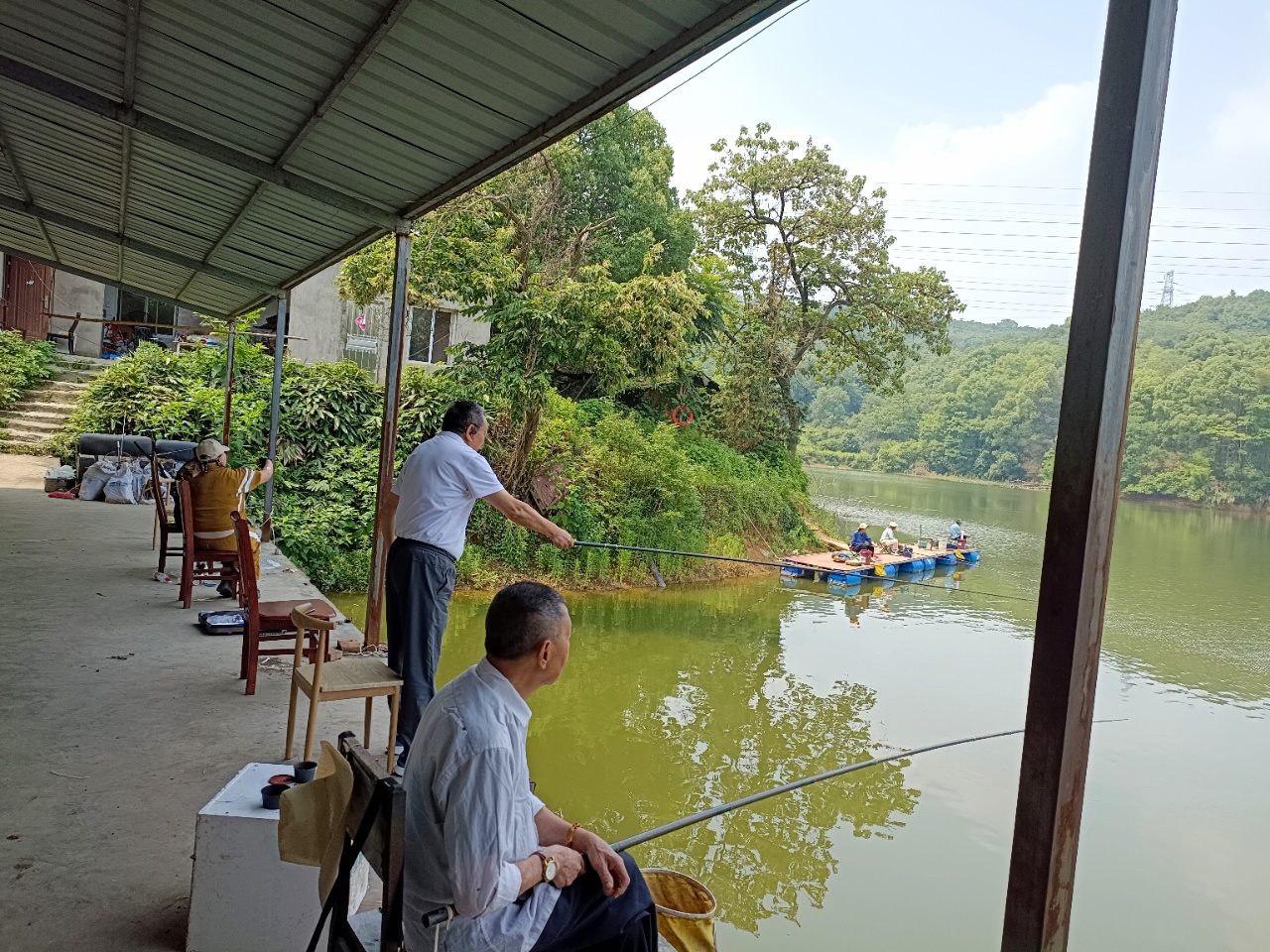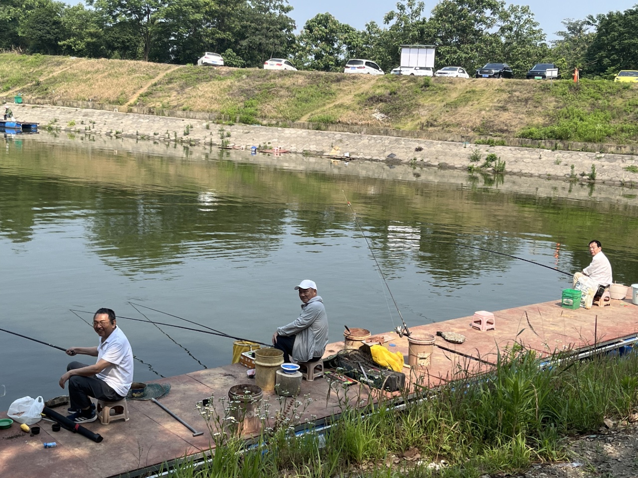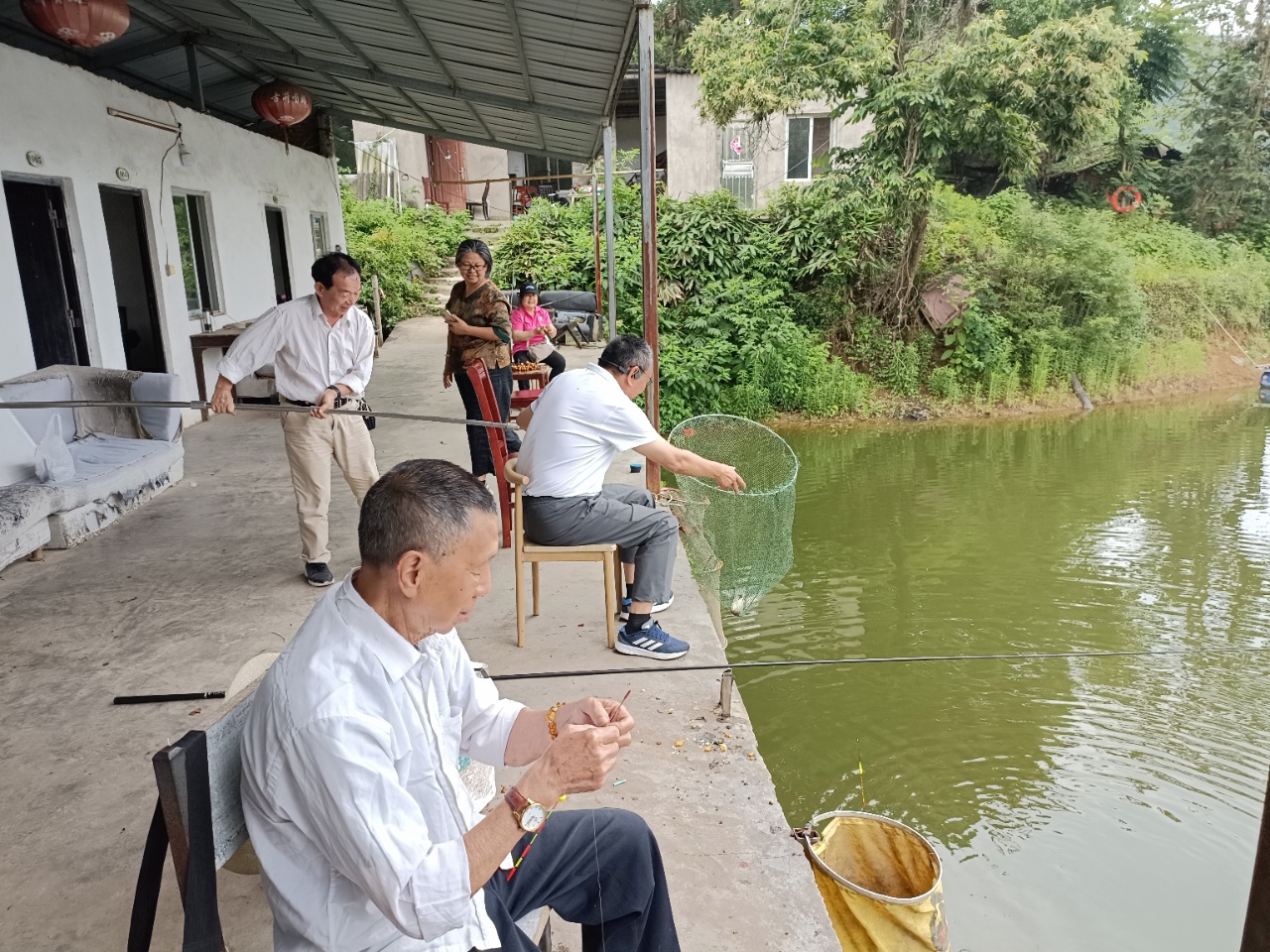 水面波光粼粼,岸边绿树成荫,退休老教师们专注钓鱼的身影,构成了一幅悠然自得的美好画面。